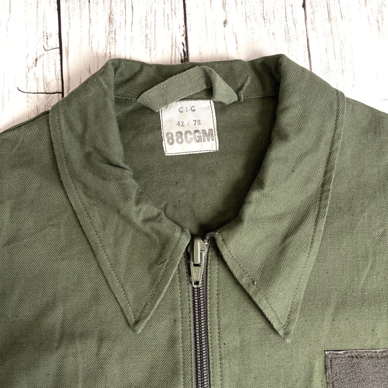 市場でも殆ど見かけることのない激レア商品、フランス空軍のユーティリティジャケットです。フランス軍らしい厚手のツイル素材でシャツとアウターの中間のようなシンプルなデザインです。フロントには「YKK」ZIPが採用されている為、おそらく製造は古くても'80年代のものかと思われます。袖口はボタン開きではなく面ファスナーが採用されています。襟はレギュラーカラーのためクセがなく、あらゆるスタイリングとも好相性です。厚手のコットンは「M47前期型」を思わせるかのような素材感で、着込んでいくうちに愛着のある風合いが得られること間違いなしです。実物を見つけることすら難しいアイテムですので、探されていた方はこの機会にご検討ください。